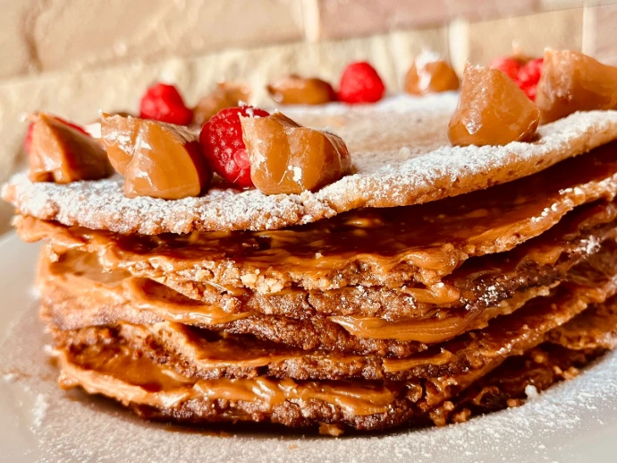 Deliciosas y crujientes capas de masa nuez, donde el manjar o dulce de leche reposa entre ellas, una gran combinación, un gran postre con identidad, al estilo Texao.